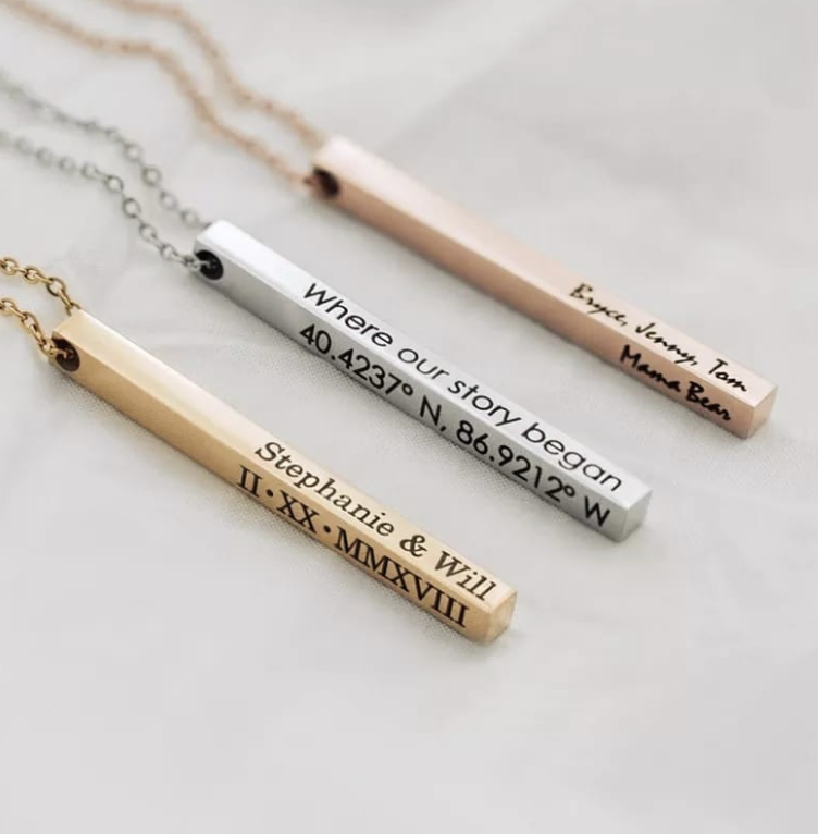 Náhrdelníky: nejvhodnější jsou přívěsky s plochými tvary, například oválné, kulaté nebo obdélníkové destičky. Na takovou destičku dokážeme precizně vyryt jméno, datum nebo jednoduchý symbol podle Vašeho přání.