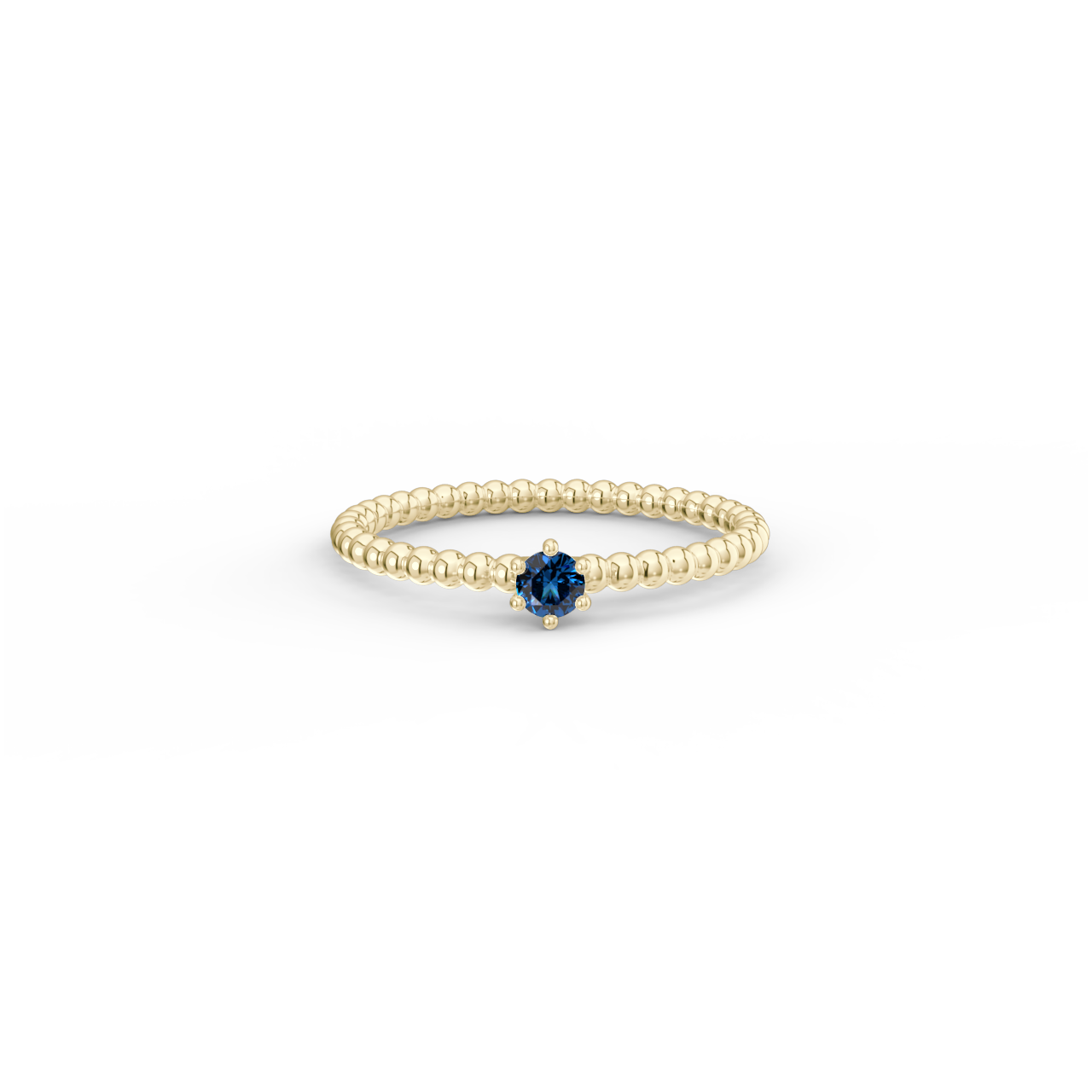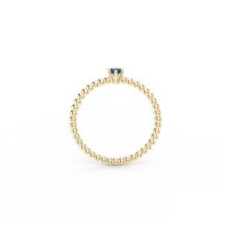 Prsten z kuličkového 14 Kt žlutého zlata s modrým safírem o velikosti 3 mm.