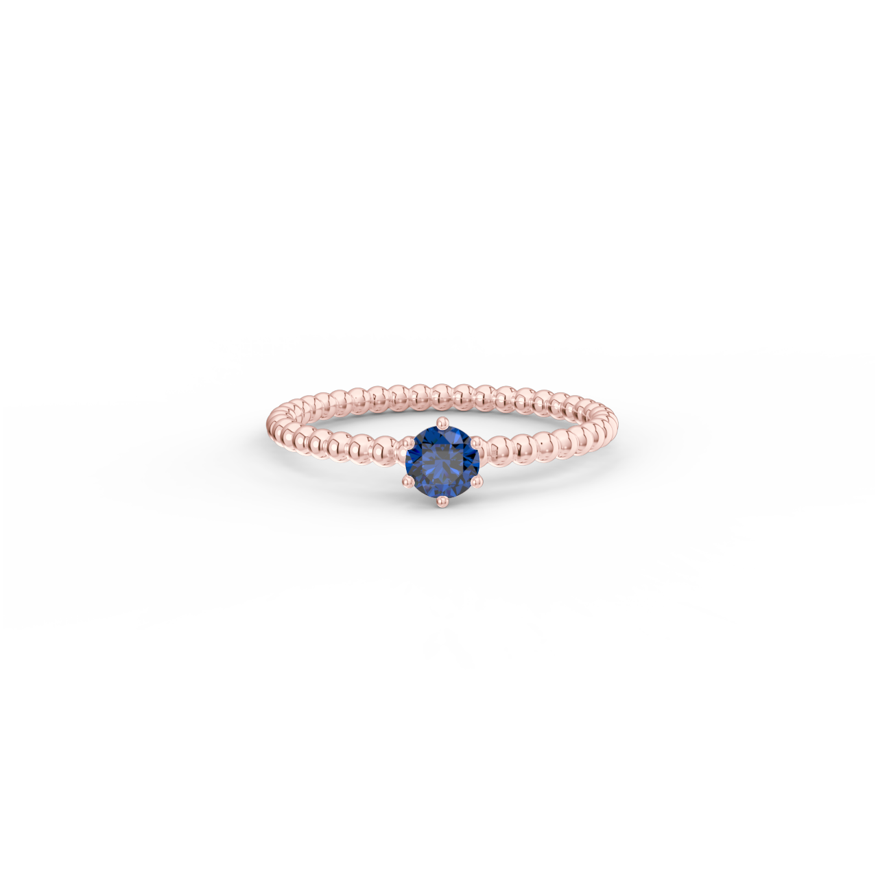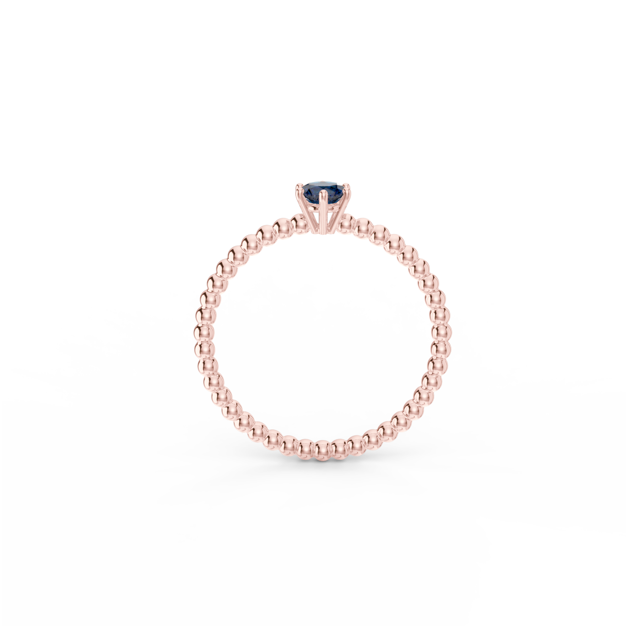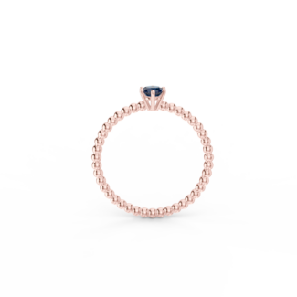 Prsten z kuličkového 14 Kt růžového zlata s modrým safírem o velikosti 4 mm.