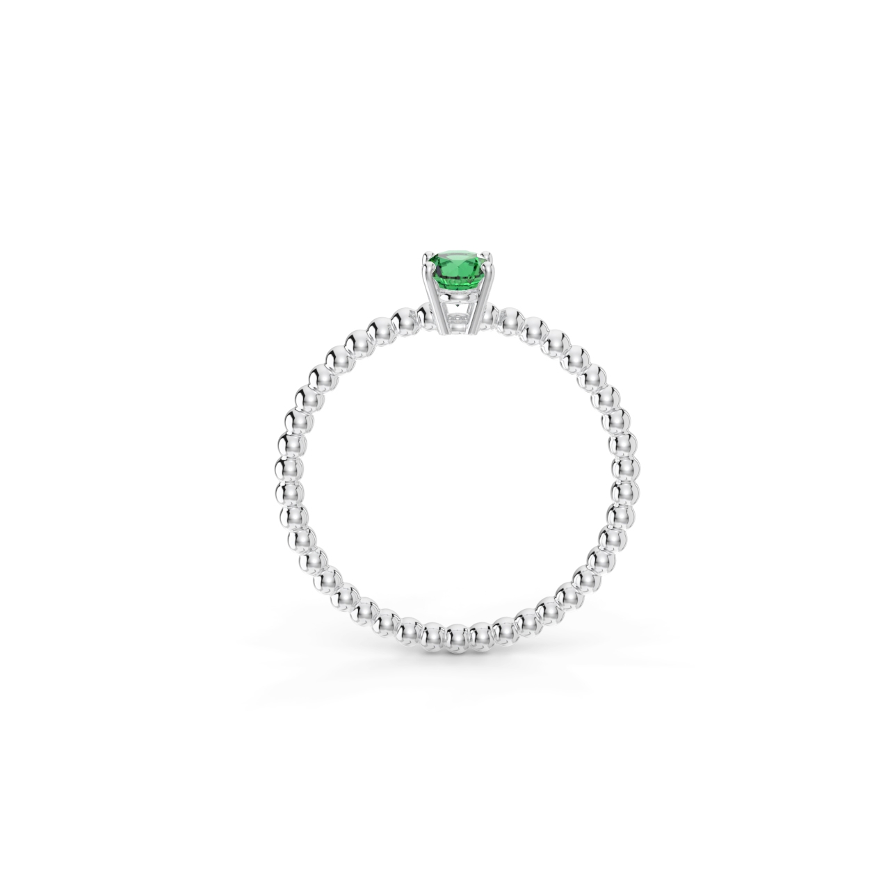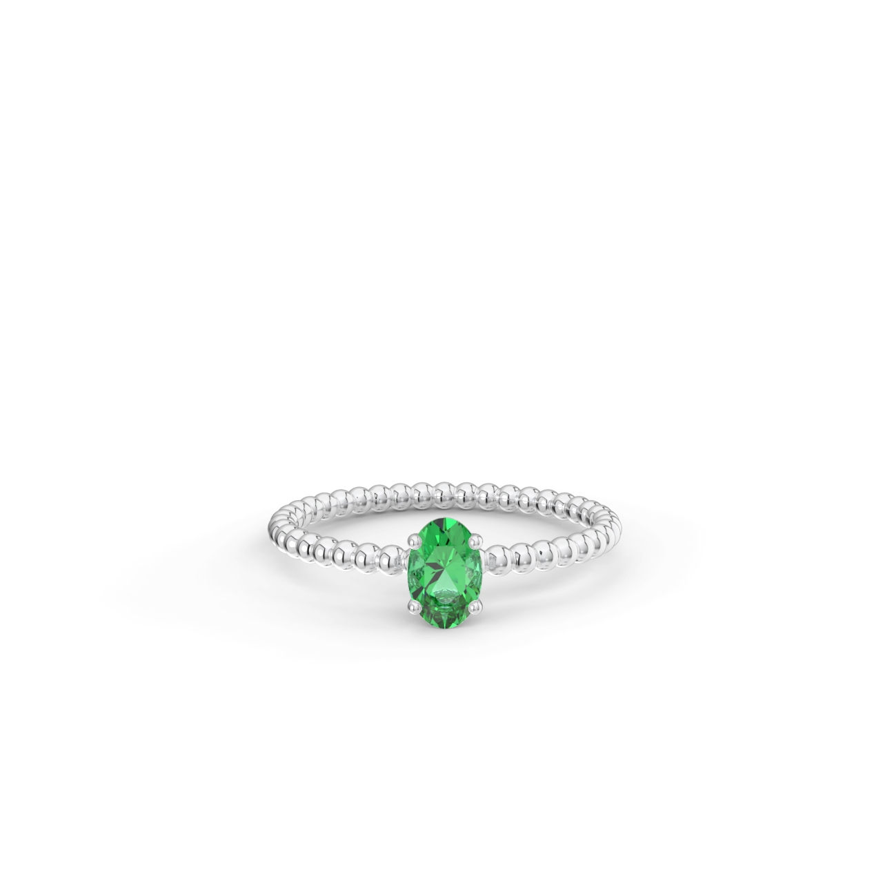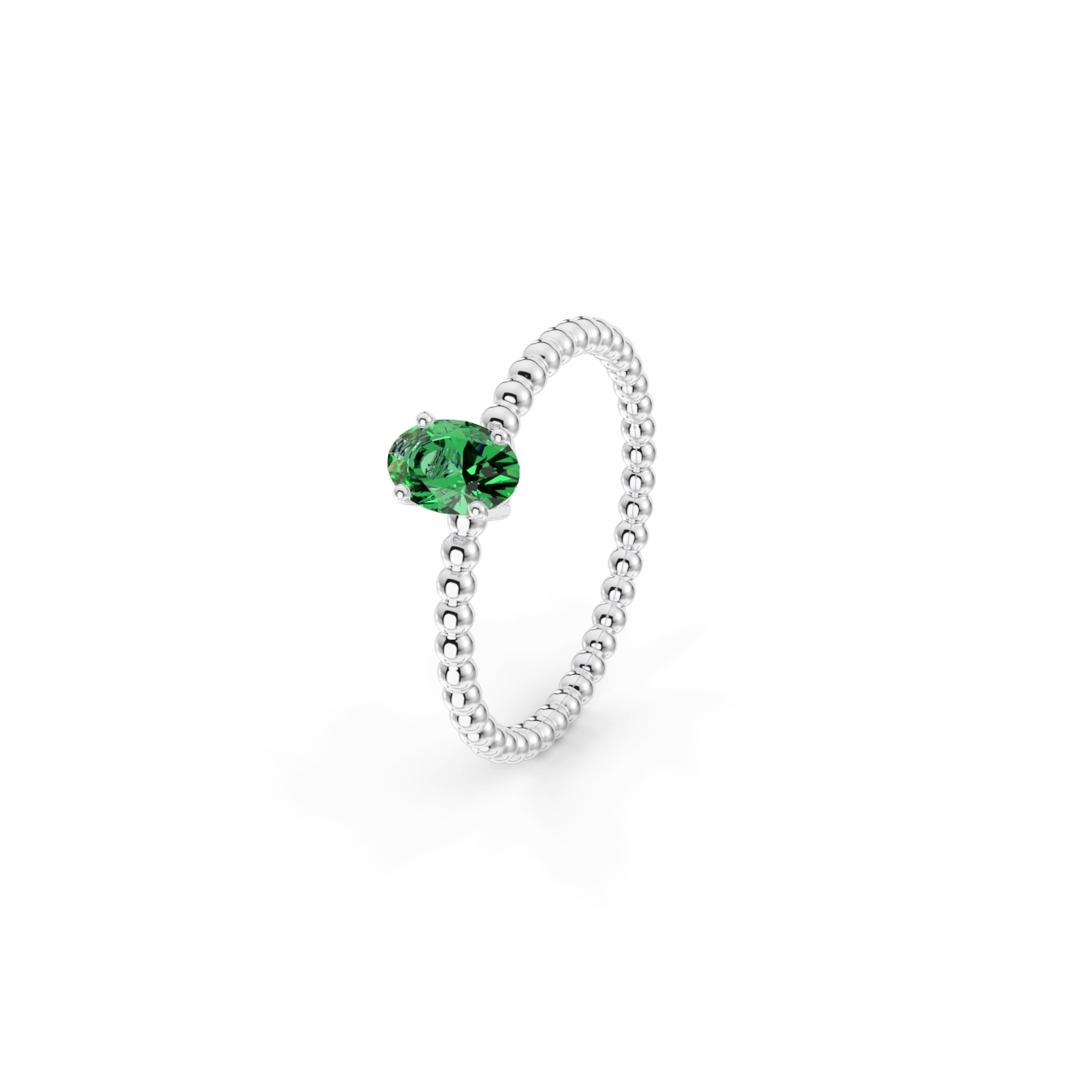 Prsten z kuličkového 14 Kt bílého zlata s oválným smaragdem o velikosti 6 x 4 mm.