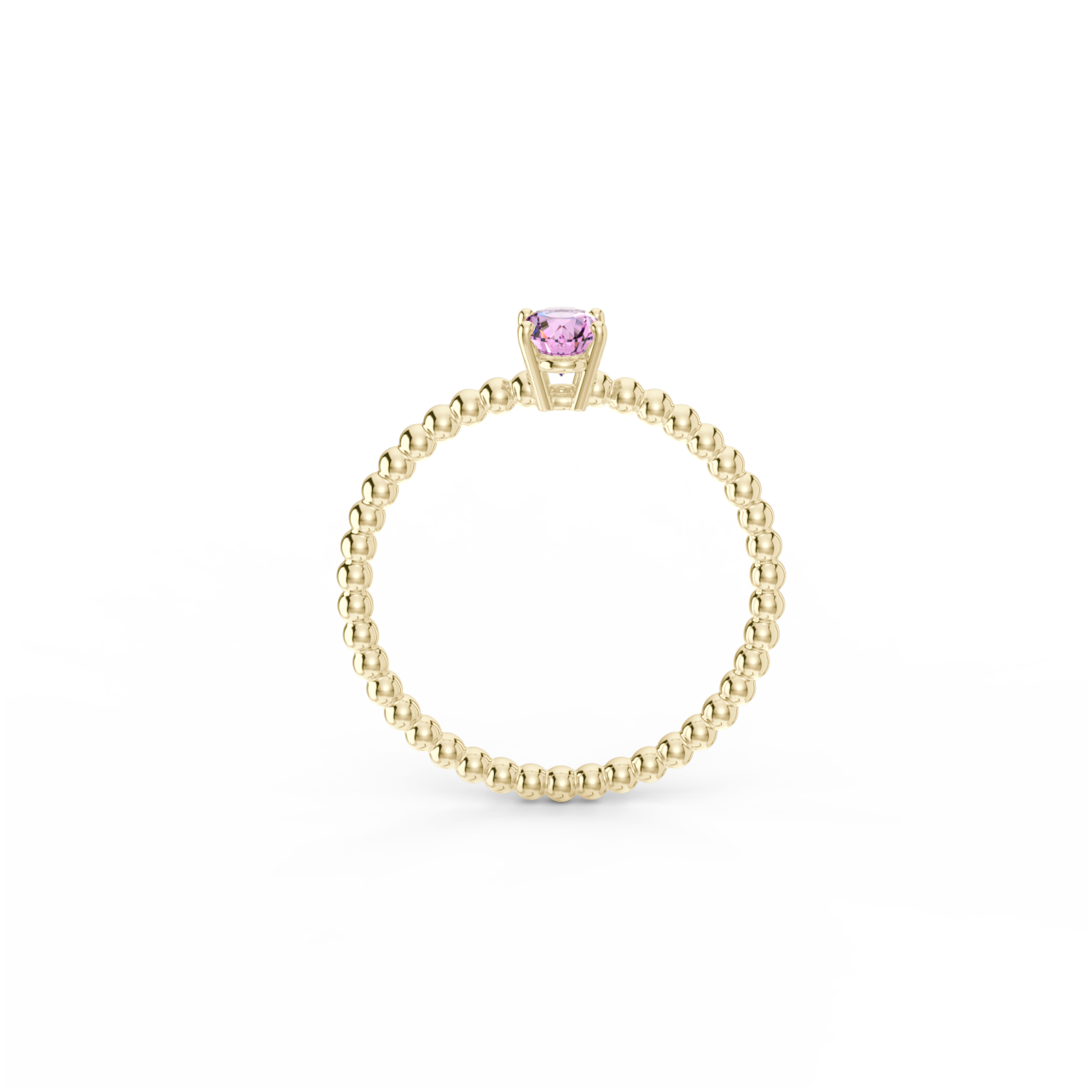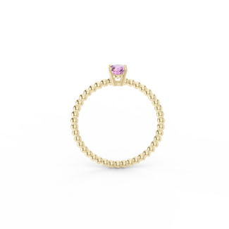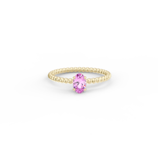 Prsten z kuličkového 14 Kt žlutého zlata s oválným růžovým safírem o velikosti 6 x 4 mm.