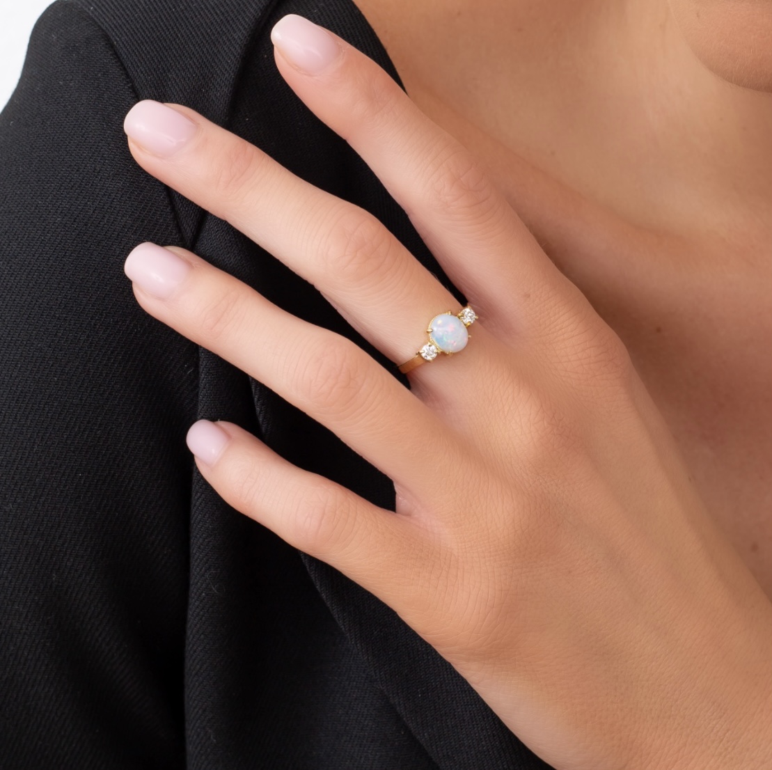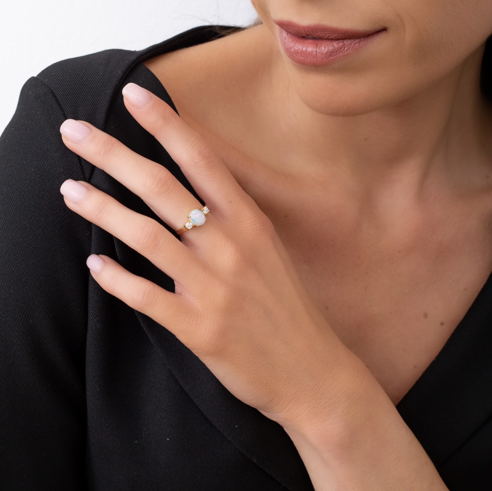 | Prsten se slovenským opálem a přírodními diamanty ze 14 Kt žlutého zlata. Tento vzácný opál z nejstarších opálových dolů na světě má velmi silnou opalizaci a výjimečnou kombinaci barev. | |