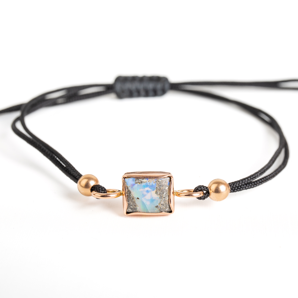 Andezit se slovenským opálem v obrubě ze 14 Kt růžového zlata doplněný o 2 kuličky ze 14 Kt růžového zlata (rozměr 4 mm). Shamballa náramek je variabilní délky k přizpůsobení velikosti vaší ruky.